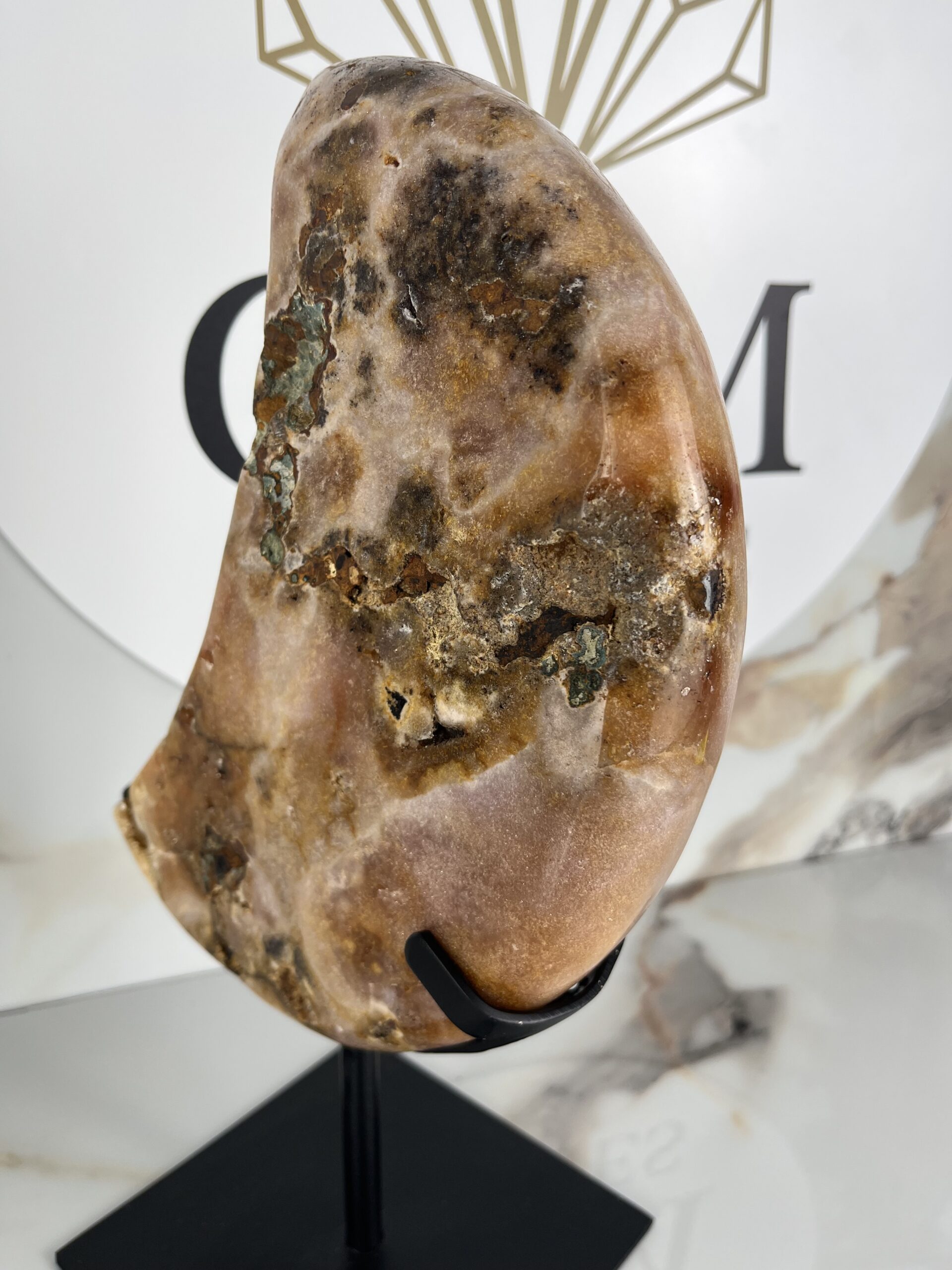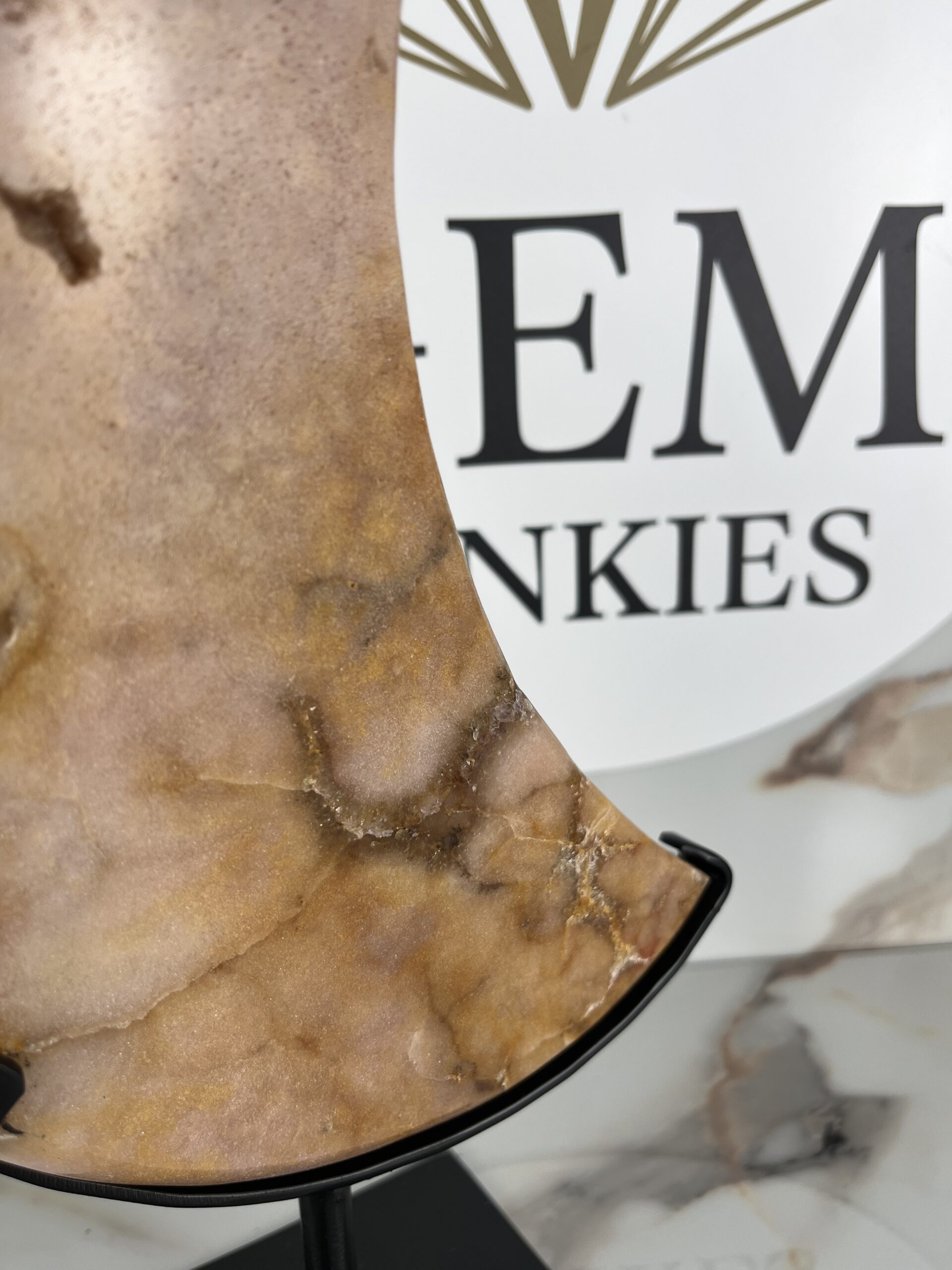 Deze prachtige roze amethist maan van 2,46kg staat op een zwart standaard. Het kleurenpalet is fantastisch en van hoge kwaliteit. Dit kristal is 29,5cm hoog.